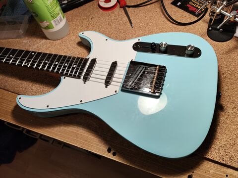 Meg volt a fiókban egy tele bridge sárgaréz babákkal, azokat is átraktam erre.A pickup megszívatott, mert ezeknek az új szériás Super Distortion T-knek már csak a PCB az alaplapja, nem érnek letestelt fémhez a csavarok, mint egy rendes telénél, így nem testelődik le a bridge. Erre már csak akkor jöttem rá, amikor felhúroztam, ezért lelazítottam a húrokat, nagynehezen felemeltem egy-két centire a "hamutálat", aztán némi rézfólia segítségével becsempésztem egy testkábelt a híd alá. Gyárilag nem volt, mert nem szükséges.