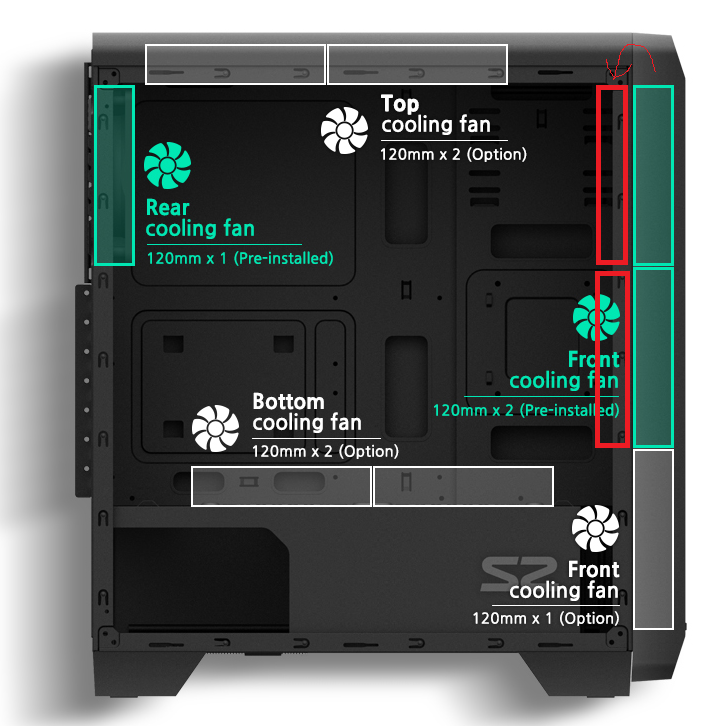 Na már most... Előre kettő oké(3x120mm/2x140mm). Hátra kettő nem ok, csak hátha 1, abból is csak 120mm-es. Felülre 2x120mm/2x140mm. PSU shroud 2x120mm.