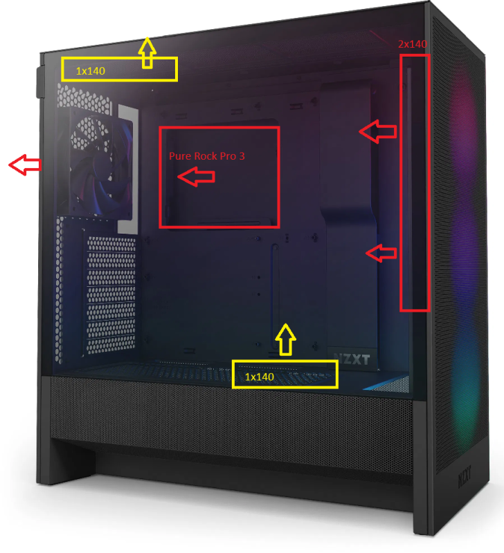 A sárgával jelölt helyekben nem vagyok biztos, hogy kellenek-e. Bár így is marad egy házhoz kapott 120-as ventilátorom, mert kettőt kaptam. Így lehet a balansz miatt kettő be és kettő ki lenne és akkor felülre tennék egyet. Csak olyan szűk ott a hely. Igazából szerintem ott vákum keletkezne