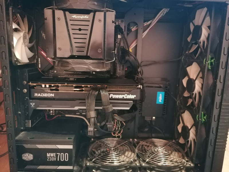 Ahogy néztem, a CPU hűtő körül túl sok hely nem marad. Hátra a házhoz kapott 120-as ventilátort tenném. Ez nem PWM-es. A konfig: Ryzen 7500f + Sapphire Pulse 9070XT. Két SSD lesz az alaplapon, más nem igazán fog helyet foglalni.