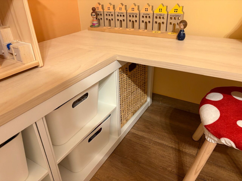 Például, ehhez csak megfelelő méretű fúró kell. A munkalapot leveszed, alulról összehúzod és az immáron L-alakú pultot visszarakod.