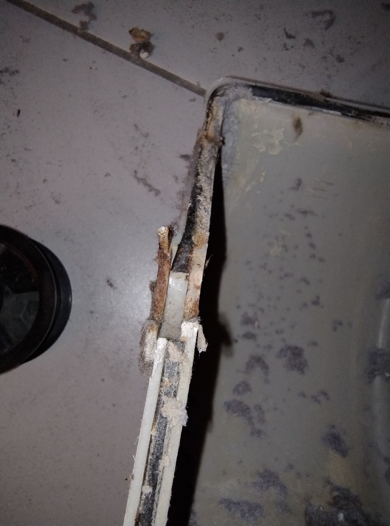 Ezen a Whirlpoolon a túl gyengére tervezett, vékony alsó ajtónyitó műanyag már korán eltört, és emiatt oldalt nyitjuk, így a szigetelés is kicsit csúnya ott, de nincs átszakadva, nem okozott ez eddig hűtési problémát. A dobozok is töredezettek belül. Valamint oldalt sajnos a mosogató szárító részéről odakerülő viz miatt elkezdett rozsdásodni is (ami a mi hibánk, a következőnél tenni fogok oda valami védelmet)
