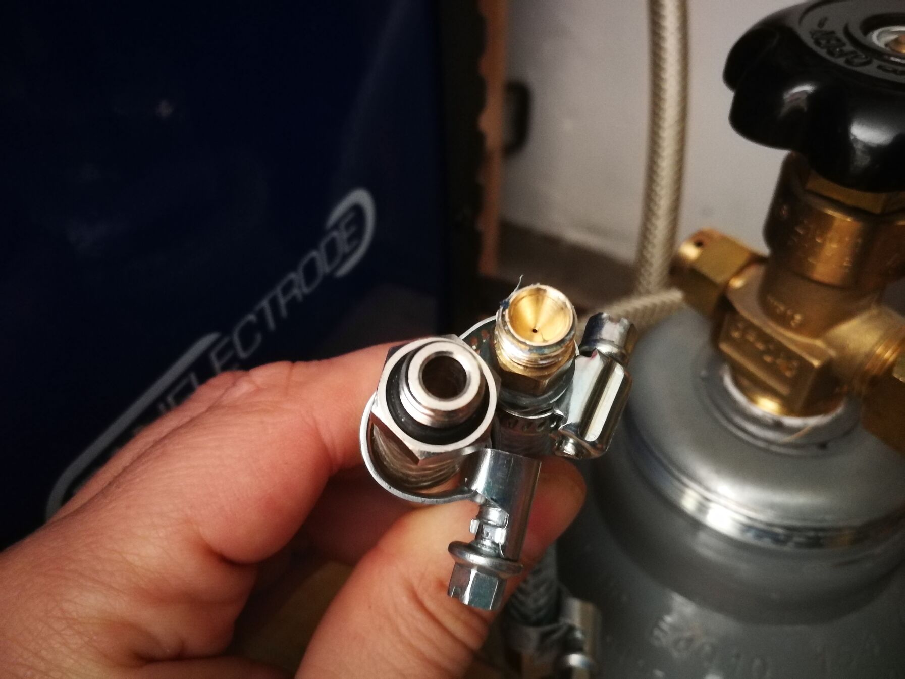 A reduktorból kijövő szelep, amire a gázcsövet kell csatlakoztatni, annak a külső átmérője 6mm gyárilag (ebben van a szűkítés, a képen ennek a belsejében van az a pici tűhegynyi lyuk), tehát 6mm belső átmérőjű csövet kell ráhúzni. A hegesztőgépből kijövő tömlőcsatlakozó viszont 8mm belső átmérőjű csővel kompatibilis. Ezért cseréltem le a reduktorban lévő 6mm-es tömlő csatlakozót 8mm-esre, hogy a 8mm belső átmérőjű cső mindkét végét 8mm külső átmérőjű szelepre húzzam rá. Viszont csak olyan 8mm-es szelepet kaptam szerelvényboltban, aminek nincs belső szűkítése. Ez a két szelep van egymás mellett a képen.