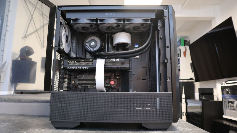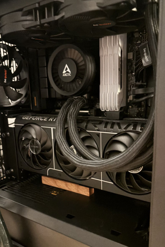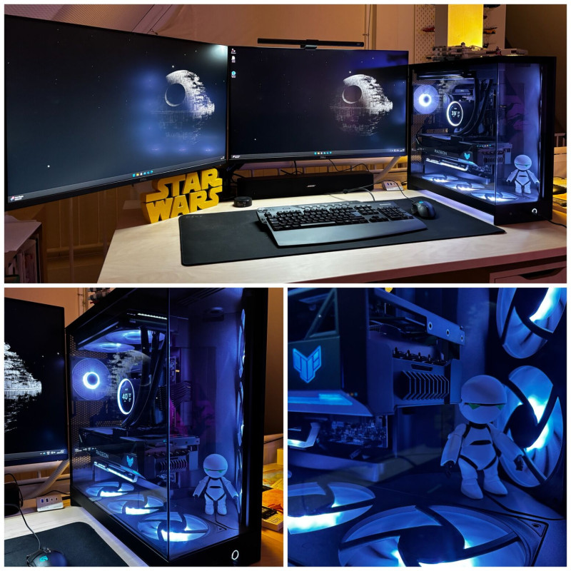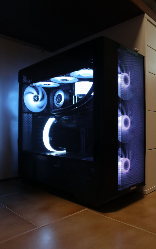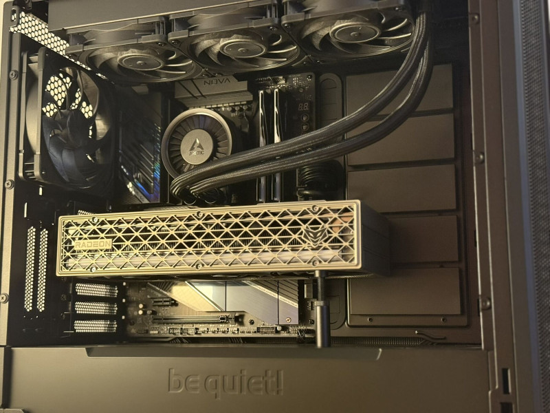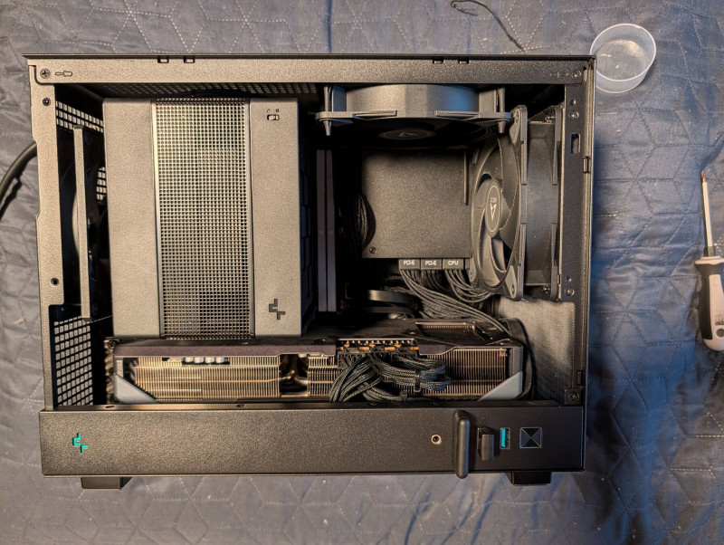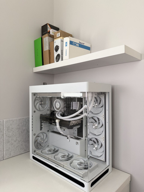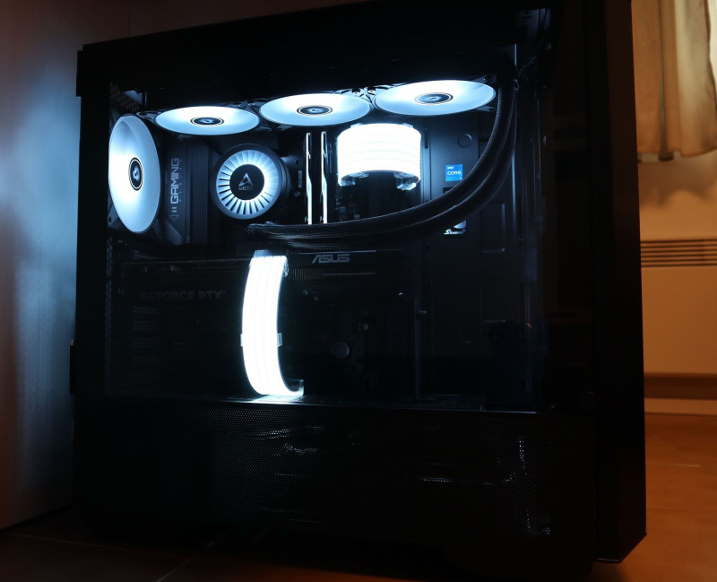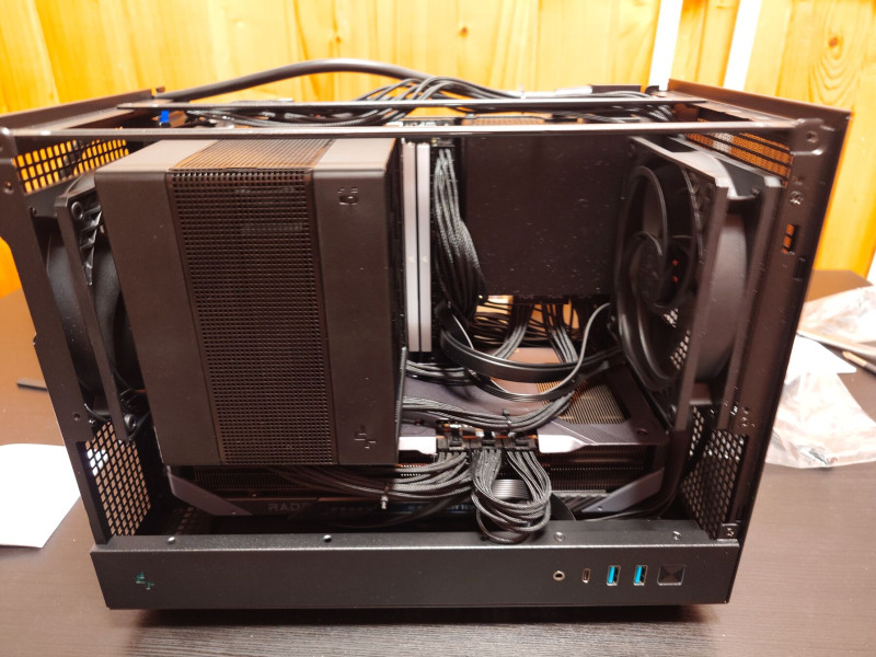 . Ezek a képek csak szerelés közben készültek, variáltam azóta... A végleges úgy néz ki, ahogy leírtam. Hátul van egy 12-es Arctis P12 ami befelé szív a CPU hűtőre telibe, a CPU közepében egy Noctua venti van ami a frissen betolt levegőt szívja át és tolja ki előrefelé ahol az a kis tér maradt a gépházban, onnan 2 Arctis P12Max szívja ki, egy felfelé és egy előre. A VGA lentről szív és felfelé tolja ki a meleget abba a térbe ahonnan a két P12M szívja ki. Ezzel nyertem kb. 2-3fokot. -