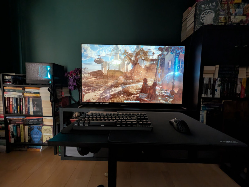 Szélességben ez ugyanakkora, mint egy ultrawide és alul felül sem kell a monitor szélét lesni. Karosszékben hátradőlve, billel és joystickal is teljesen kényelmes, a jobb oldali kijelzőn meg vagy streaming / discord / spotify ilyesmik mennek.