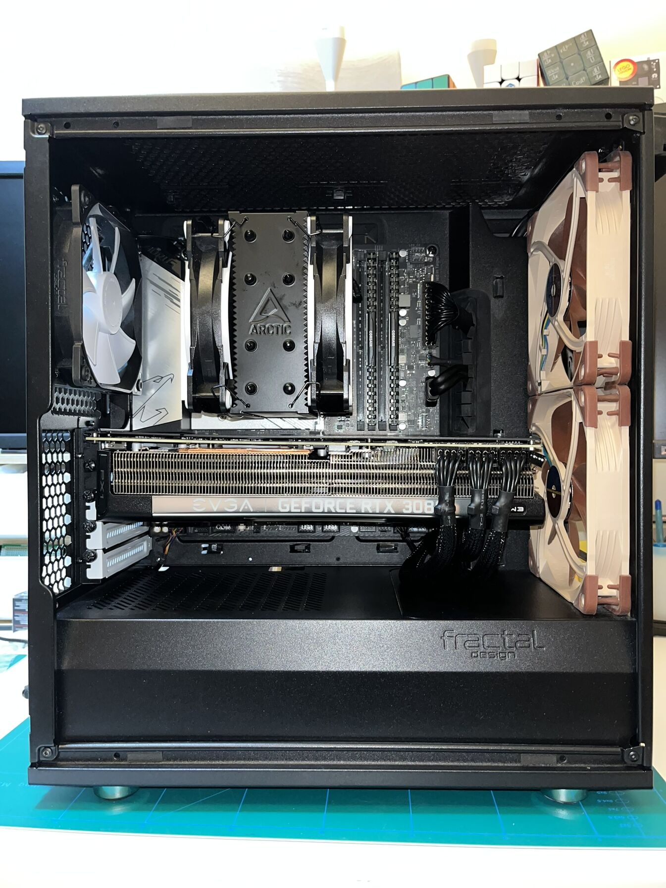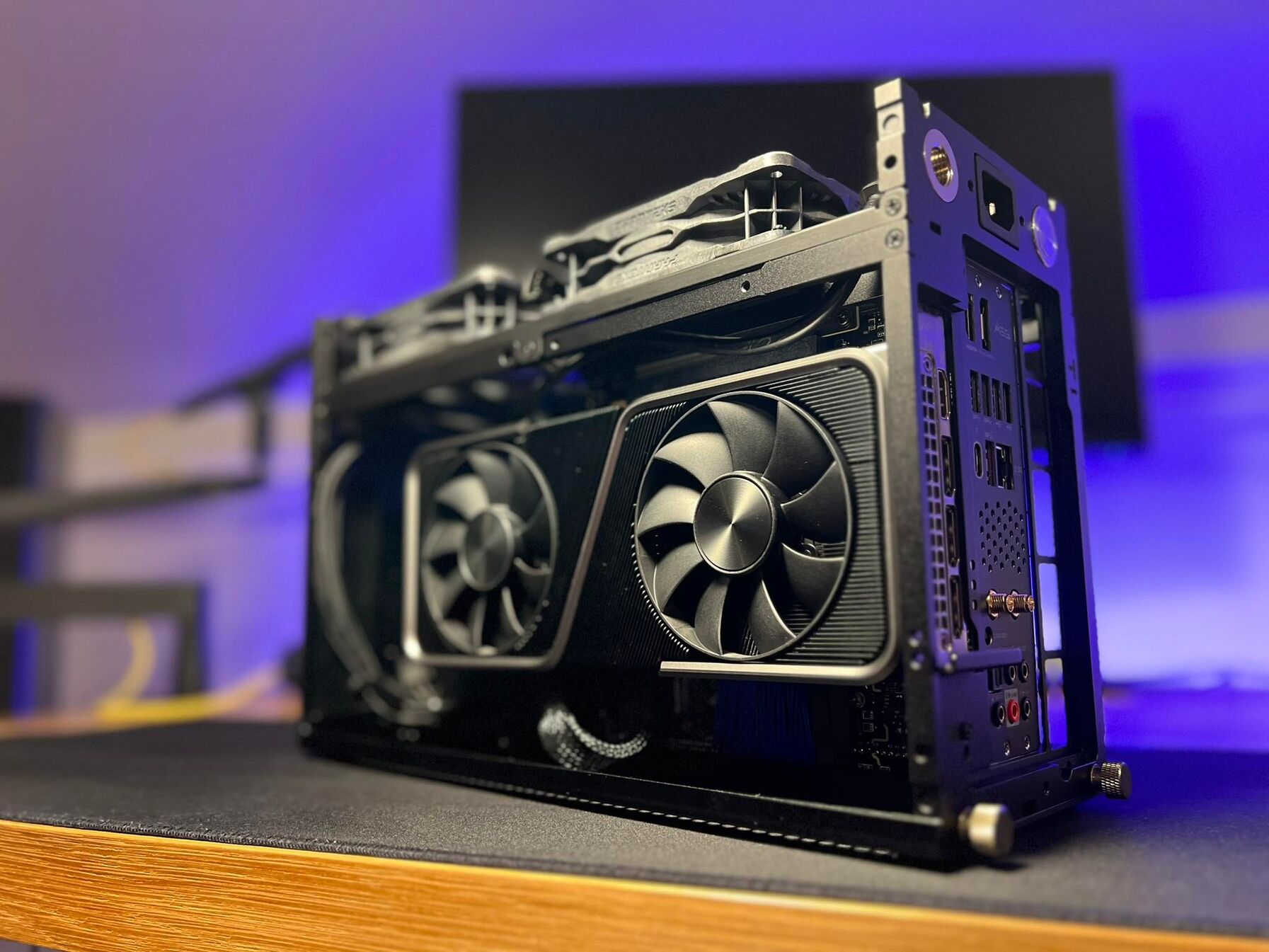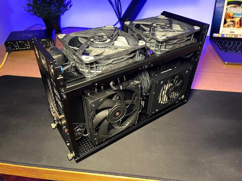 A rács most csak illusztrációként van ott, (majd lesz oda plexi és nagyobb kivágás hogy jobban látszodjon oldalról) ez a ház kitölti a teljes szélességet, oldalról nem kap levegőt, de alul és hátul szinte teljes kivágása van az asztalnak amin a gép csücsül szóval bőven tud beszívni és kifújni levegőt.