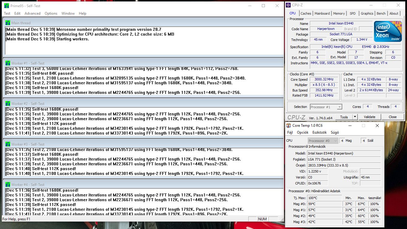 Na most egyelőre 3,2 GHz-en járatom a 2,83 GHz-es E5440-et, 1,2 Voltos feszültség mellett (tehát még mindig valamivel a default 1,225 Volt alatt), 377-es FSB mellett - tartós terhelés mellett így átlagosan 45 Celsius fokot mutat az AIDA64.