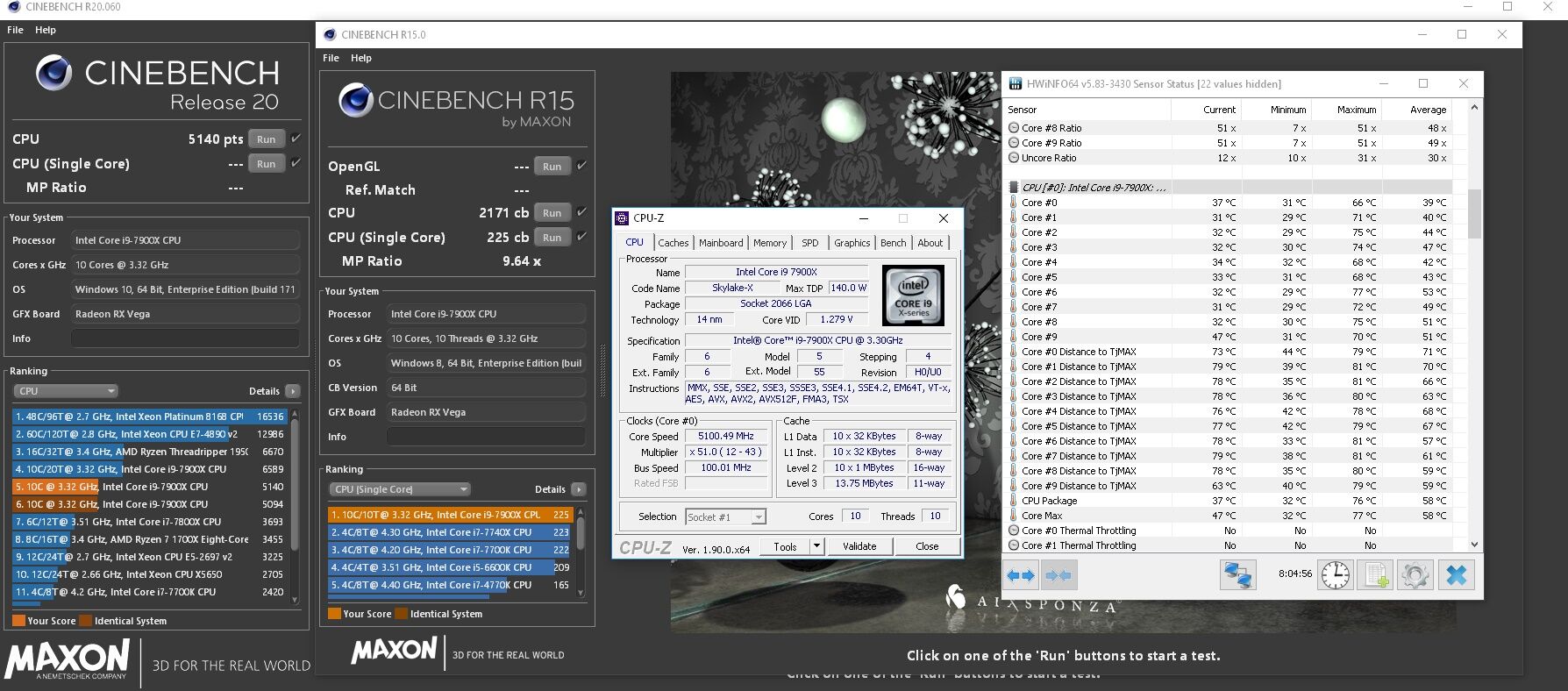 Ki lehet fogni jó 7980xe prockót is. Némi munkával és csiszolgatással a hűtését is meg lehet nagyon jól csinálni. Itt van például egy 5,1Ghz-es vízhűtéses példány 1,39v körüli Vcore-val. 5000 pont körüli CBR15-el. nem rossz.