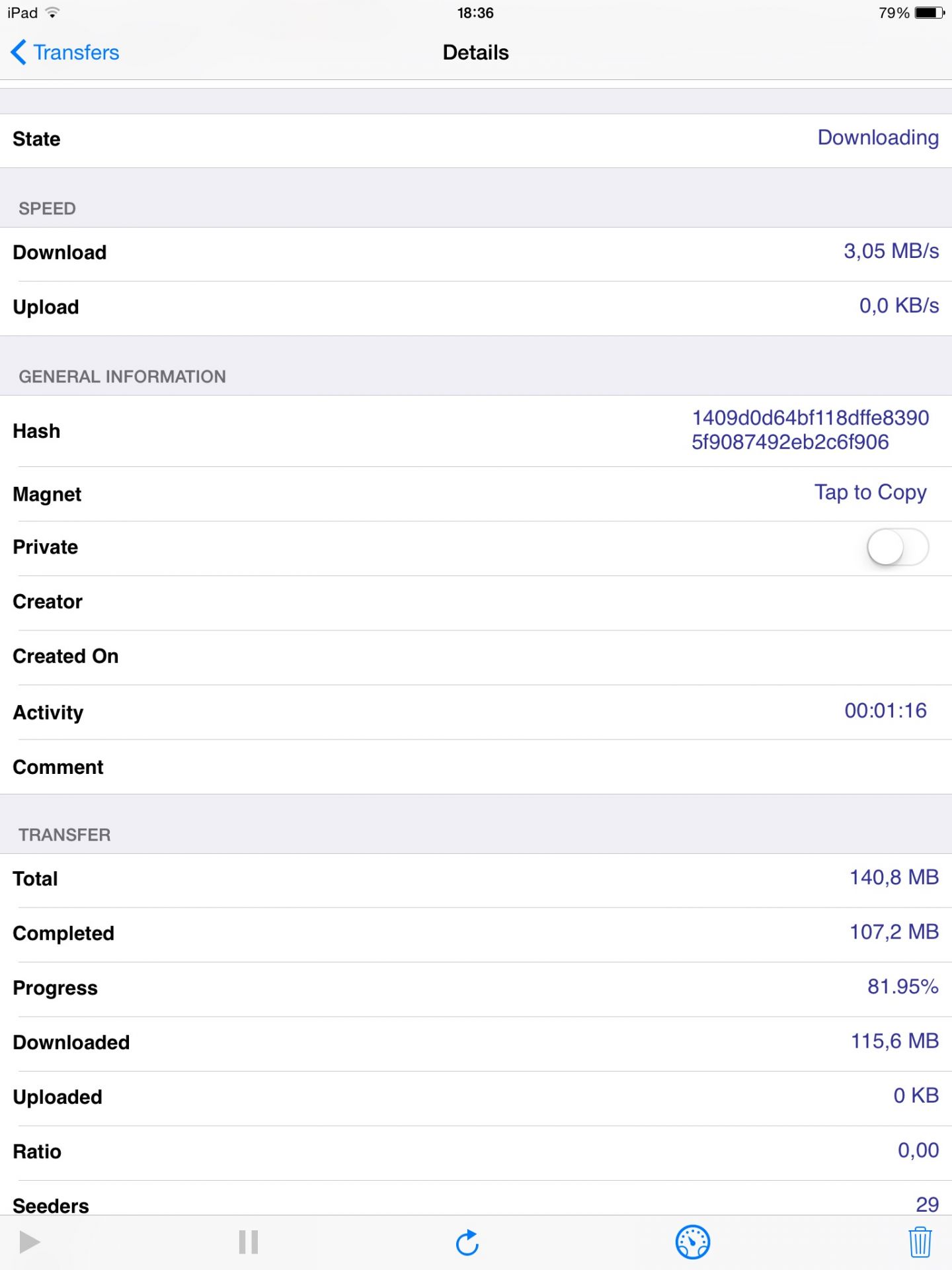 IPad -re nem a iTranssmisionel lehet letölteni ( legalábbis nekem ezzel nem ment) hanem NAS -ra. A iPadre úgy lehet hogy kell telepíteni valami Downloader Managert ( nekem Download Pro van,de lehet más,pl.iDownload). Amikor megnitod a download managert a böngészőbe a m.zbigz.com kell beírni. Ez ugyanis a torrent link letöltő. Ebben kell bemásolni a linket majd ő letölti a download részébe. Teszek fel képet. Annyit tudni kell hogy a így letöltöt fájlt nemtudod tabletről seedelni.