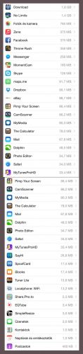 Ott fel vannak sorolva milyen alkalmazások vannak telepítve, és mennyit foglalnak. Összeadtam a kiírt adatokat. Elég durva: 6,4 GB-ot foglalnak el az applikációk összesen (pontosan átváltottam MB-ot GB-be), 12,2 GB a kapacitás (tehát ebben nincsen benne az iOS), ennek ellenére 329MB a szabad hely az iPad szerint.