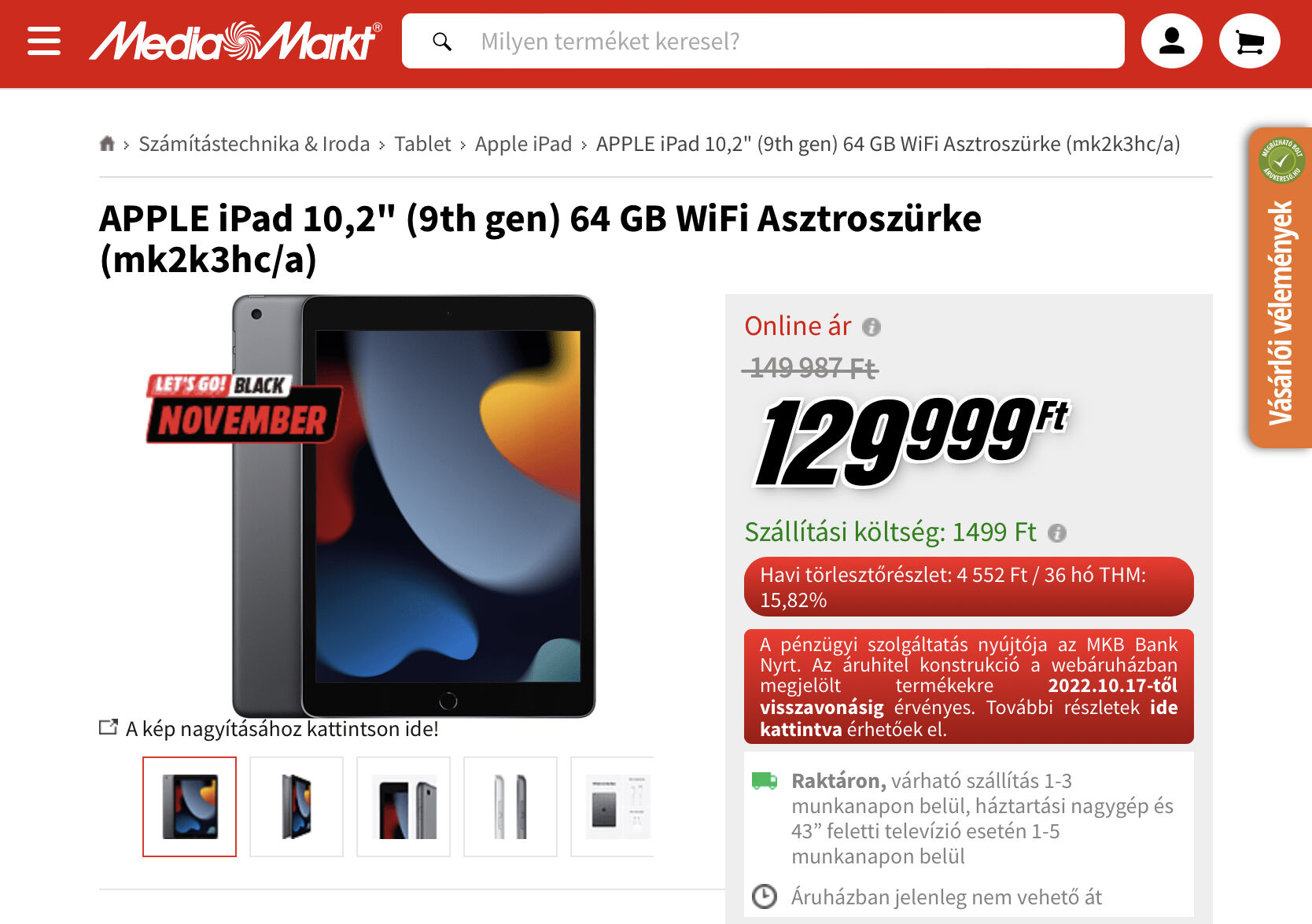 iPad9 a sparban 134.999 akit érdekel esetleg 24-30-ig(a honlap szerint)
