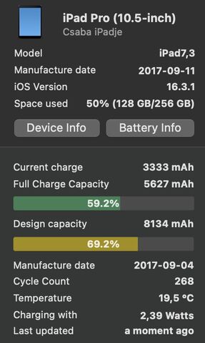 Ja és iPaden nincs Akkumulátor egészség ellenőrzés beépítve, érdemes a vásárlásnál ránézni külső programmal: Windows - 3uTools / MacOS - Coconut Battery. Kiírja a ciklusok számát, és a jelenlegi maximális kapacitást. -