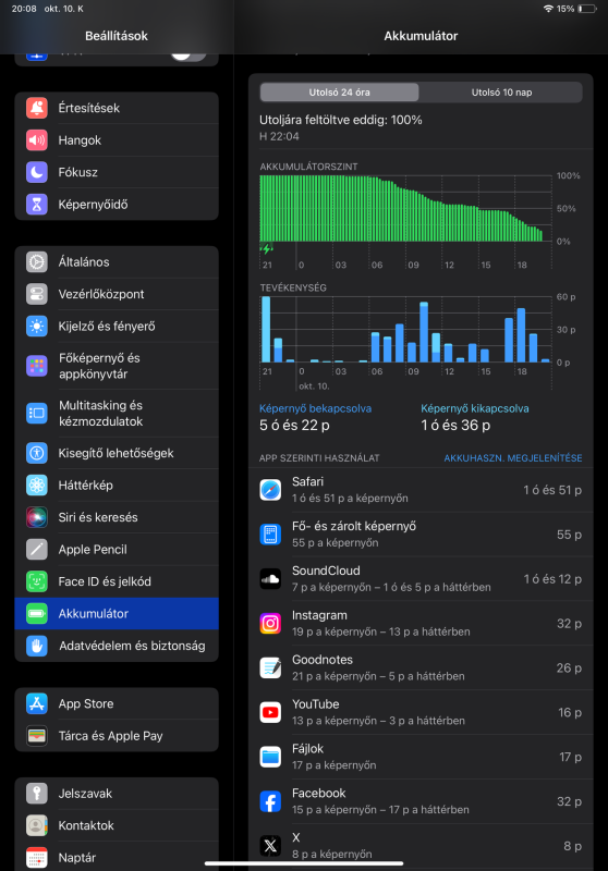 Van egy iPad pro 11 2022 készülékem, öt hónapos. Nagyjából mi lenne az elvárt üzemidő? Előtte egy Air 3 tabom volt, de úgy érzem annak az akksiideje még két év után is jobb volt. Van valamilyen funkció, amelynek kikapcsolása javítana az uzemidon? Az Assistive touch be van kapcsolva, valamint főleg Apple Pencilt használok az érintéshez. Köszi!