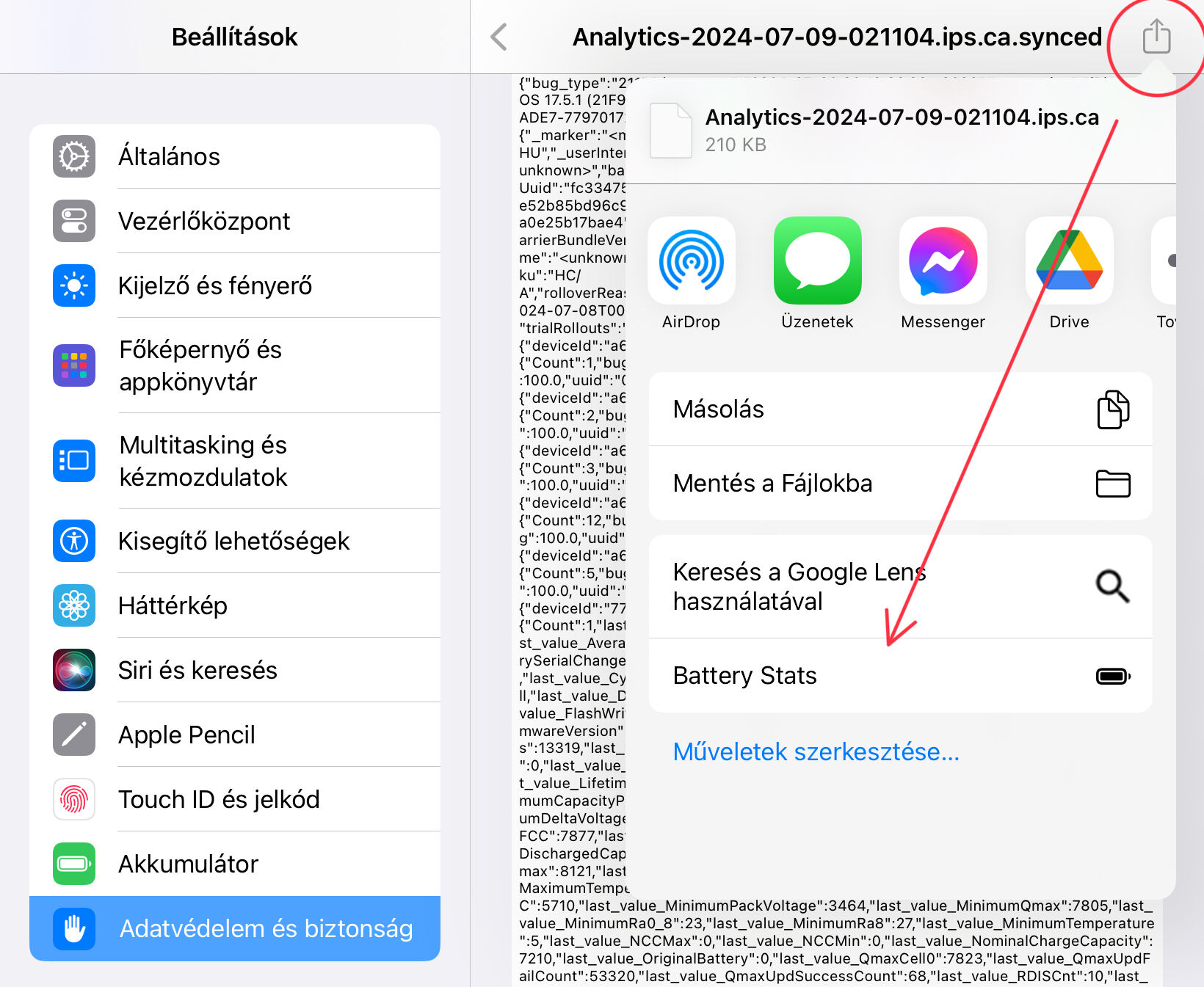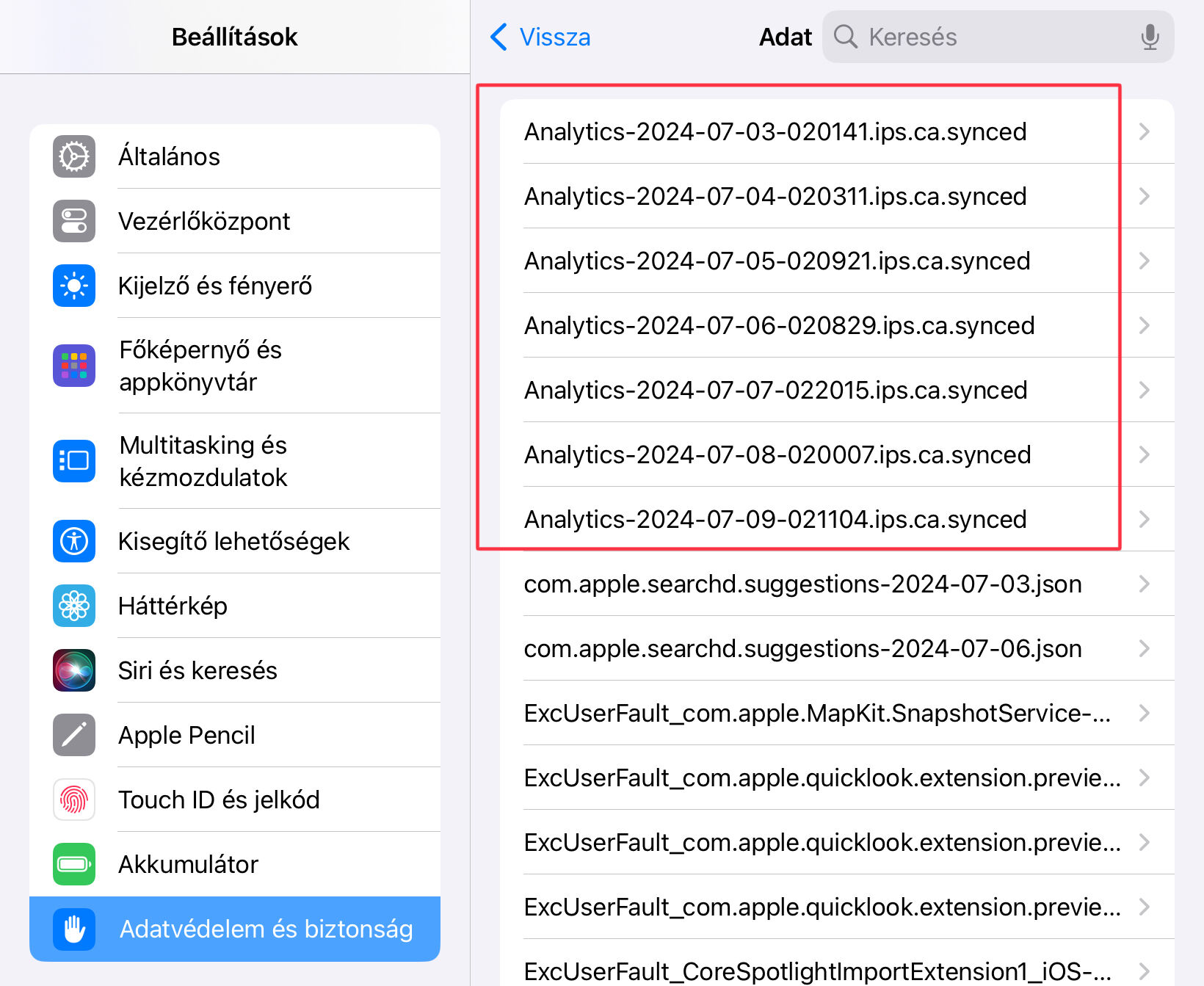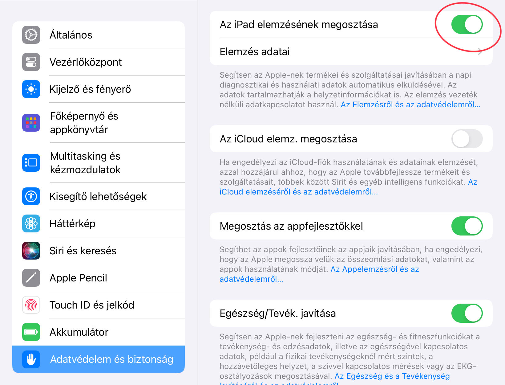 2. Beállítások / Adatvédelem és biztonság / az iPad elemzésének megosztása ON (ha nincs alapból bekapcsolva, 1 napot lehet várni kell, míg készítsen egy log fájlt).