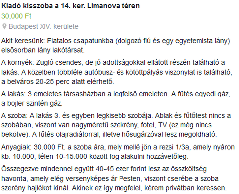 Én olyat látok, ahol ennyiért szobatársakat keresnek, nem lakótársat. Ez meg azt jelenti, hogy koli vagy menekültszálló jellege van, többen alszotok egy szobában, nincs külön szobád se.