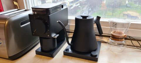 Na, megvolt az első textiles V60 is. 1.2-nél 15 gramm 2:30 alatt lett kész, holnap ezzel a beállítással megnézem a 18 grammot, de lehet, hogy az 1.1 lesz az ideális. Az 1-es állás jelenleg nem használható, összeérnek a kések, de ezt tudtam előre: