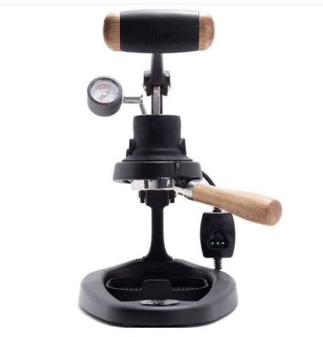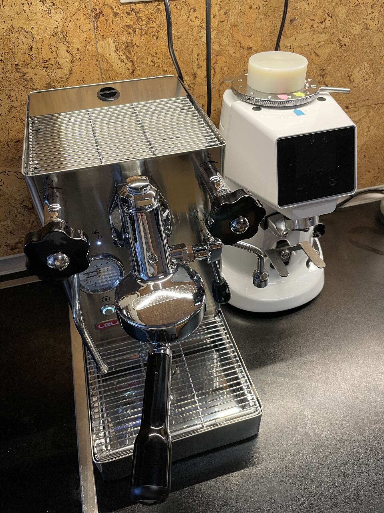 A mostani felállás más. Az 58.5-es tamper túlságosan is szorosan illeszkedik, nem tudom szépen, könnyedén megforgatni a pogácsán tömörítés előtt. Ráadásul az őrlő is más, remélem már nem sokáig.