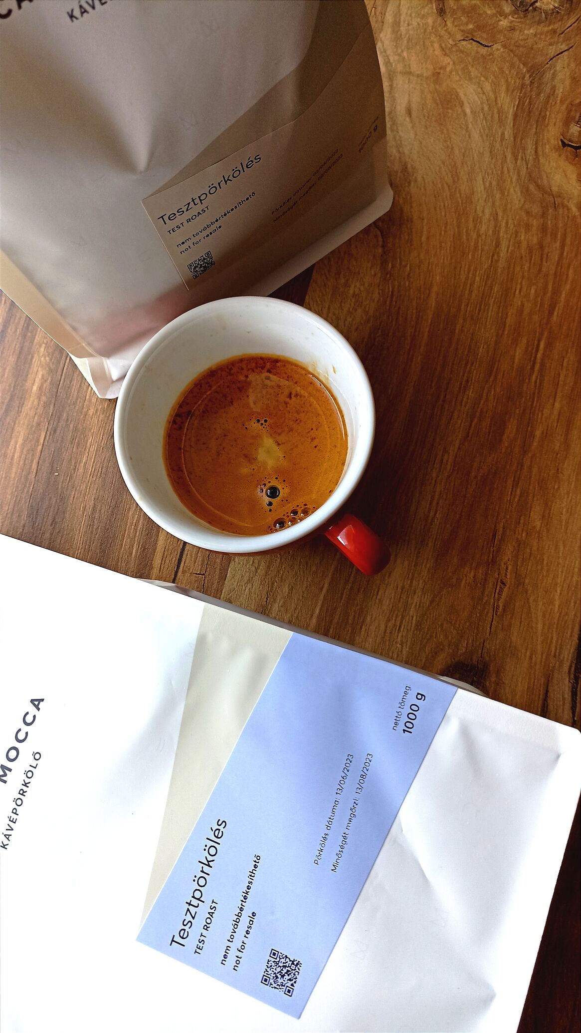 Nagyon balanszos lett már az próba shot, első kortyra valami kék bogyós gyümölcs ugrik be, van egy jóféle citrusossága, de végre nem bántóan, hanem tök jól megy a többihez, jó lenne tudni konkrétan milyen tétel. Közben megjött az új csomag, az 1 hetes pörkölés, remélem hogy nem ártott meg neki a forró csomagautomatában döglés.