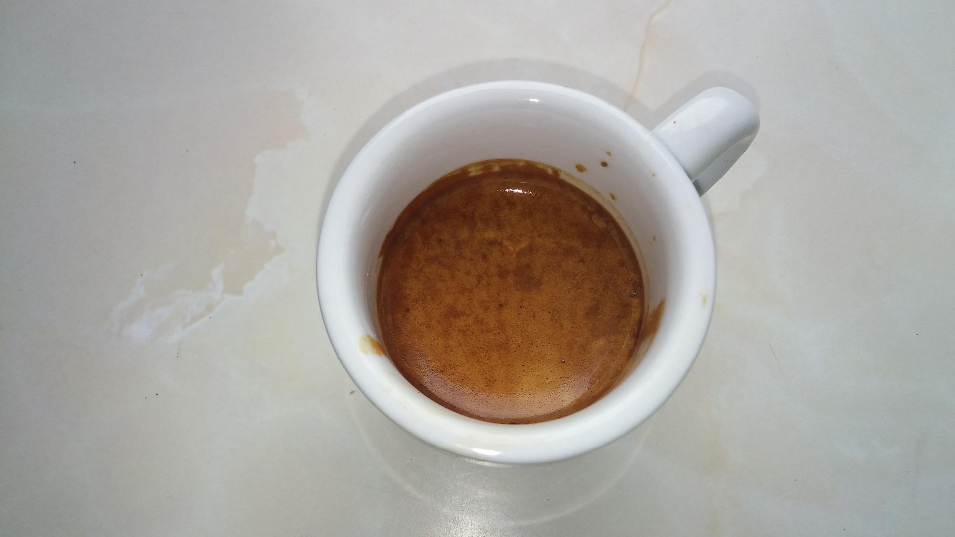 Saját, elcseszett, nyers pörkölés újrapörkölése egy hét pihi után. Sidamo + Aguas feles körüli arányban keverve. 17,5 gramm, 14-es VST, durva őrlemény, így adta ki a 30 mp dupla risztrettó mennyiséget. Nem csípi a nagyon meleget, 88-89 fok körül húztam. Próbálkoztam már lassabb lefolyással is, de akkor végig volt benne egy egyébként nem zavaró étcsokis felhang. Így viszont kimúlt belőle, csak utóízében köszön vissza. Nekem így tetszik. Finom, nem túl tolakodó gyümölcsös jegyek, olyan lassú víz partot mos kofí.