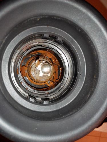 Ha beteszem a helyére és az állítógyűrűt elforgatom, még az összes alátéttel+1-es fokozaton is túl durva az őrlemény. Emiatt úgy kell összerakni,hogy a kis szerencsétlent előre be kell tenni az állítógyűrűbe, 360 fokot forgatni rajta és utána feltenni egybe, így már alap alátétekkel is jó a skála. Csakhogy a menet ott már valószínűleg sorjás volt, a nagy erőkar miatt pedig ellenállás nélkül lehetett tekerni. 3 hónapig semmi, majd letört az egyik fül..pár napra rá a másik is. -