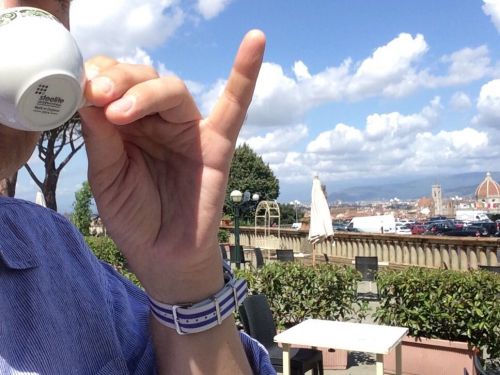 Sok szeretettel küldöm e képet Nektek, tisztelettel Roketír felé, aki tudtán kívül hagyományt teremtett ezzel a beállítással, és megkérlek Titeket, ápoljátok kicsit Blézt, aki minden bizonnyal gutaütést fog kapni, ha megtudja, ez a noname ristretto 4 Euro-mba került (plusz coperto), a La Loggia Caffé-ban a Piazzale Michelangelo-n!