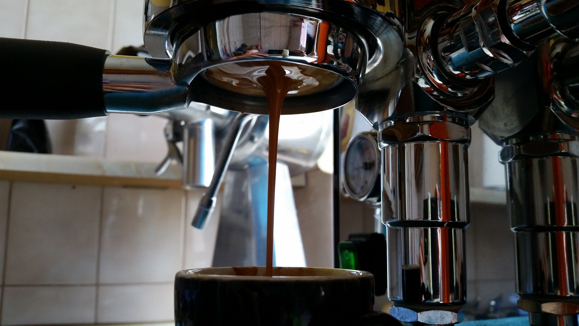 Keddi Kenya AA pörkölésből készült kofí. 18,5 gramm, 22 mp körüli lefolyás. 84 fokos fejhőmérő. Az utóbbi napok E61 HX eszmecseréi miatt írom le, hogy én hogyan állítom be a kívánt hőfokot: 1 órája ment a gép, 94 körül állt a fejhőmérő. Ezt olyan 1,5 deci vízzel lehúztam 80 fokig, majd elkezdtem kimérni a babot, darálni stb., közben újfent lehúztam a fejet, de már csak 82 fokig. Szita, tömörítés, aztán elkezdtem kiengedni a vizet, felugrott 86,7-ig, levittem 84-ig, vártam 20-30 mp-et, majd kiengedtem a forró vizet a fejből, ami úgy 25-40 ml lehetett, aztán fel a kar és csapolás.