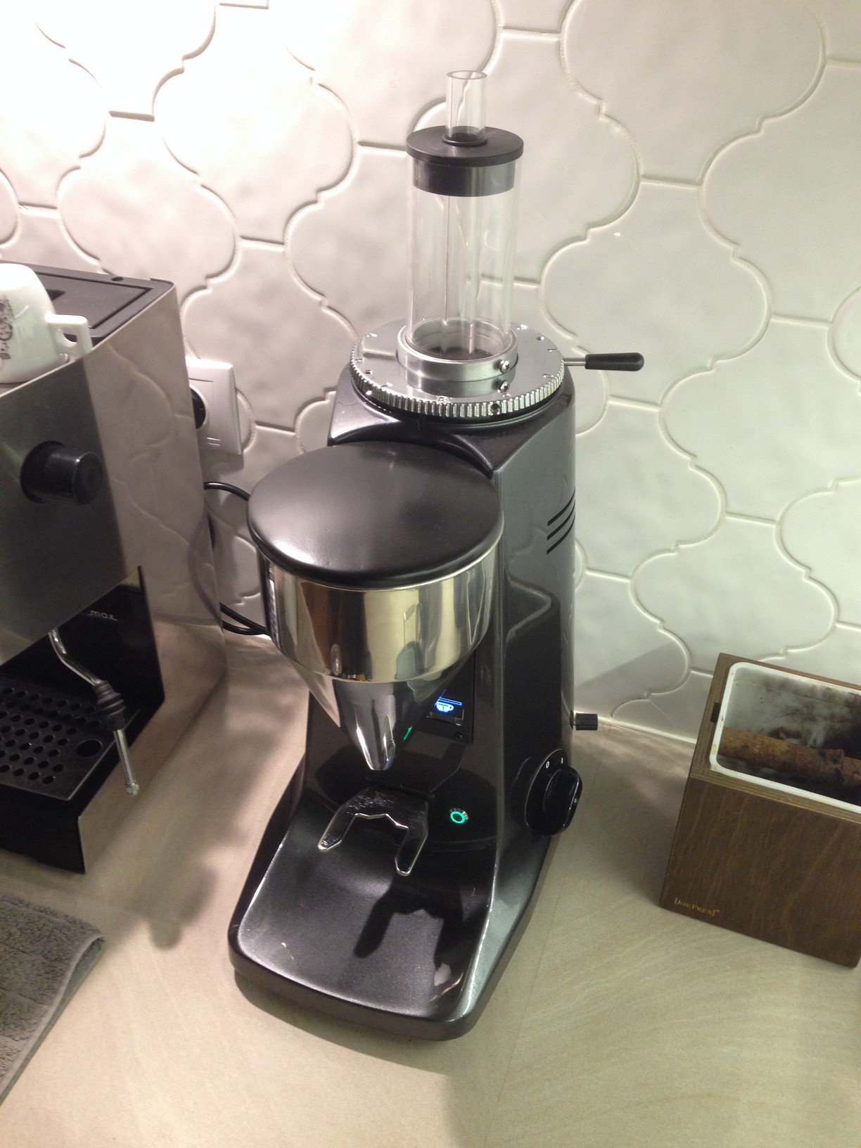 A tampersegéd csak azért van rajta,hogy ne keljen állandóan keresni.A kávé megy a garatba és a gagyi tamper a tetejére,hogy darálás közben ne pattogjon ki a szemek.Meg ha vége a darálásnak megy vissza a szűkítő és így nem tud semmi a garatba esni.Tudom nem szép megoldás,de még mindig jobb mint ha valami beleesne.Legjobb lenne esztergáltatni egy beleillő kupakot.