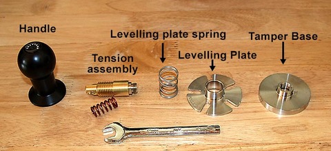 A tamperolás erejét a belső rézből forgácsolt darabban (a képen tension assembly) cserélhető rugó biztosítja. Talán két vagy három féle rugót adnak hozzá. A külső nagy rugó csak a talpat húzza vissza a széles tányérra. A gyenge rugó ellenében lenyomod a talpat ami össze tömöríti az őrleményt és utána úgy működik mint egy rugós tamper, adott erőnél összenyomódik a nyél. Egy marok tamperba össze hozni egy hasonlót azért nagy dobás mert még stabilabb mint a hosszú nyél.