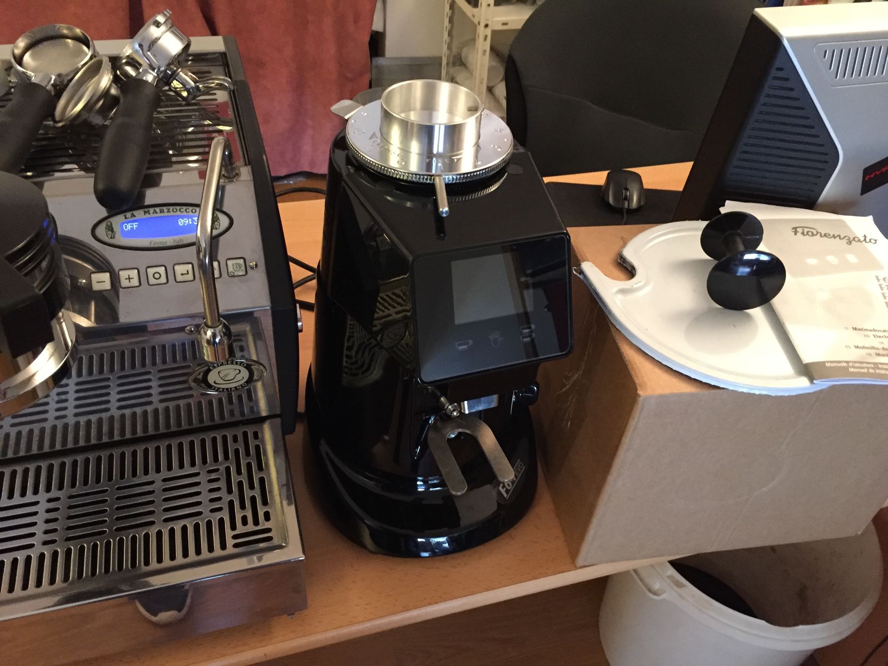 Kinu joker állásban. Spicy Italy volt előtte, tehát még a PID-hez se nyúltam. 28mp alatt jött le 42gr (17gr kávéból = 2.5 arány). Elsőre nem tökéletes, de isteni érett meggyíze volt.