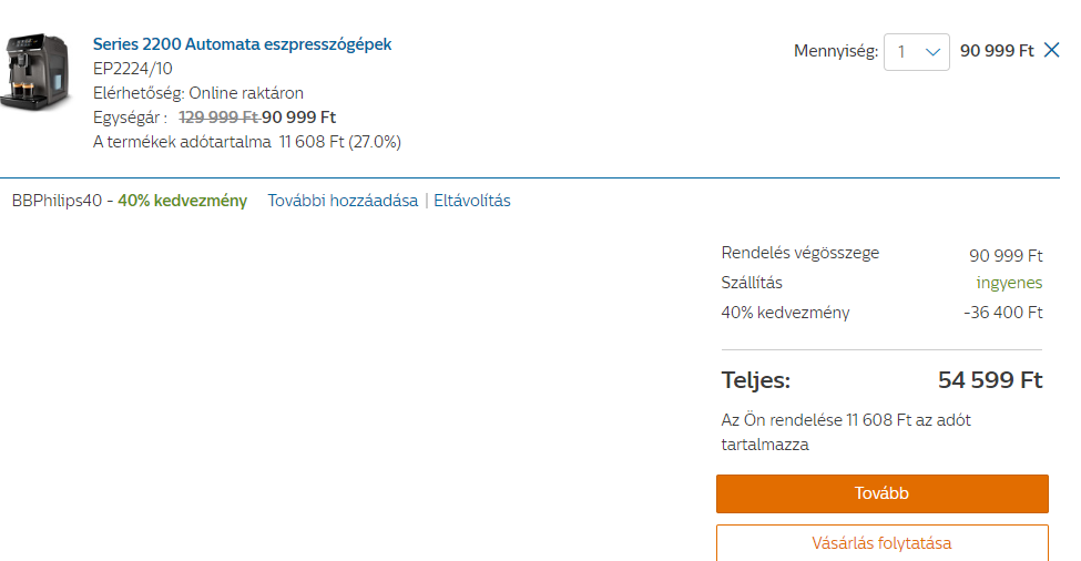 A PHILIPS-nél 40%-al olcsóbban lehet venni kávégépet kuponkóddal (BBPhilips40).