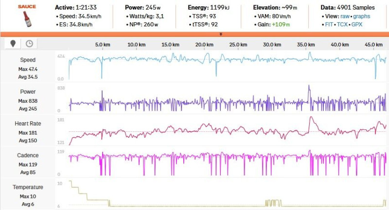 Emelkedőn egész jó volt, lejtő szimulálás az viszont totál elveszett. Nem lehetett beletekerni, ellenállás szinte nulla. Meg amúgy is, a sík és emelkedős részeken is eléggé túlpörögtek a lábaim, nem értettem. Nem voltam túl boldog, de azért mentem... nagyjából fél óra után eszembe jutott, hogy lehet, hogy a Garmin(!) pf-érzékelő miatt nem annyira jó? Egyértelmű, hogy amiben ezek keze benne van, az sz*r