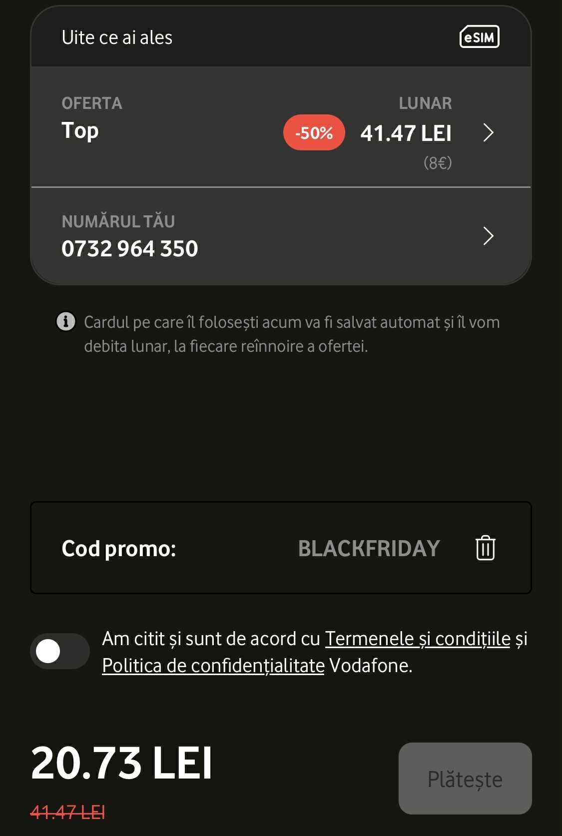 Az applikáción keresztül lehet kérni eSIM kártyát, sim kártyát csak román címre szállítanak ki, és meglévő Vodafone kártyásokra NEM vonatkozik az akció, csak új vagy áthordozott telefonszám esetén.
