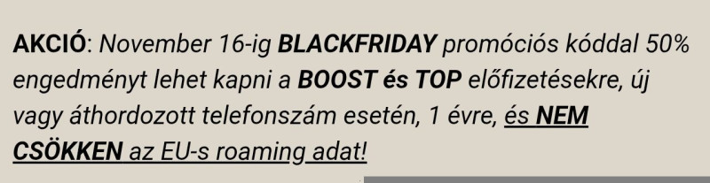 AKCIÓ: November 16-ig BLACKFRIDAY promóciós kóddal 50% engedményt lehet kapni a BOOST és TOP előfizetésekre, új vagy áthordozott telefonszám esetén, 1 évre, és NEM CSÖKKEN az EU-s roaming adat!