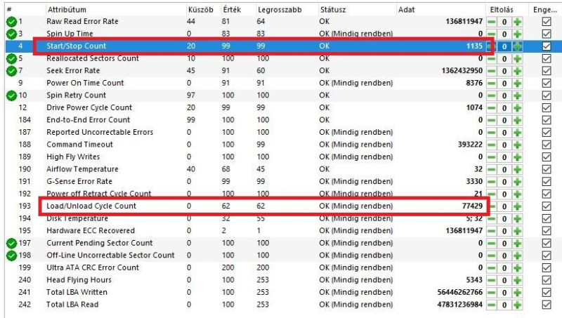 • Le lett írva, hogy igen, elvileg nem éppen optimális a HDD-nek a túl sok indulás és leállás, de ténylegesen nem feltétlen szokott gondot okozni, ami ugye esetedben is jól látszik.