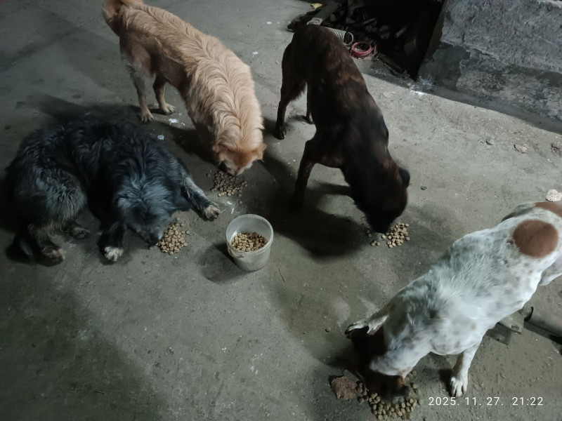 van nekik etető táljuk , de most a betonon kaptak egy kis száraz tápot , a félős is köztük van
