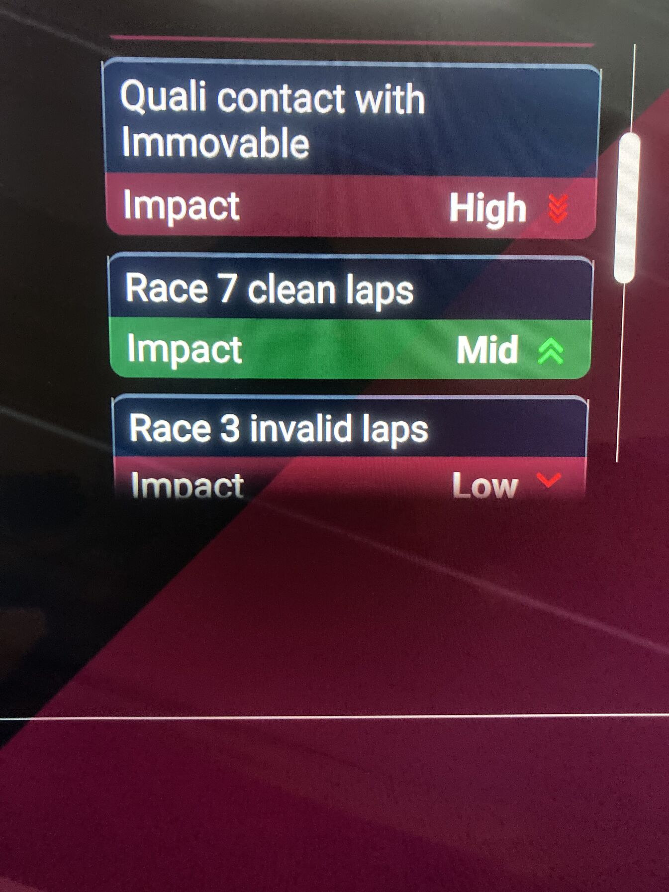 Először szépen megkaptam a trusted badge-et, xarrá zúztak többször is egy futamon, máris ledobott good-ba, megint kiütöttek 1-2x és mentem is a piros felkiáltójeles kategóriába (mostanában wet monza volt a fixed lmgt3 kategóriában, ez sokaknak erős kihívást okozott úgy látszik). Miközben az SR-em nem változott. Mi értelme van SR-nek, ha amúgy is a badge alapján dobál be (büntet) a split-ekbe?