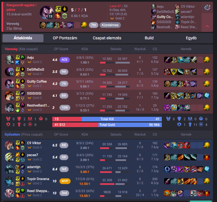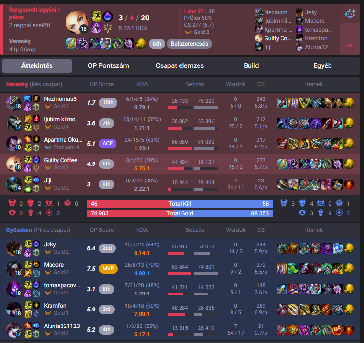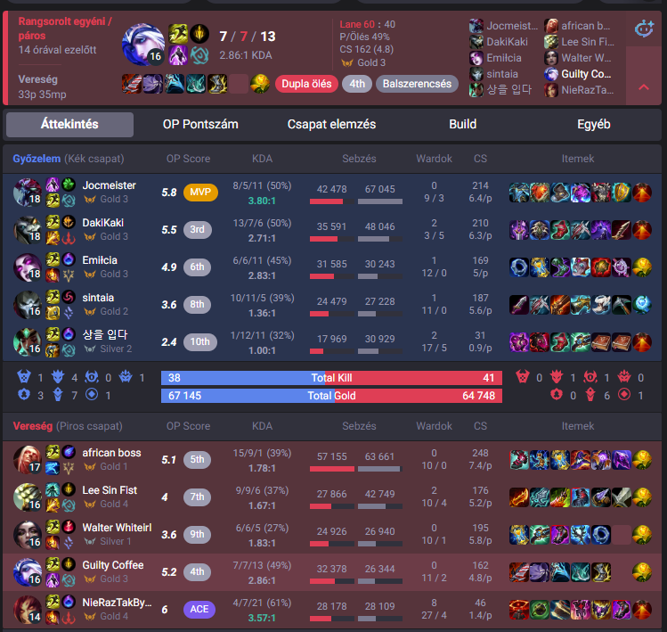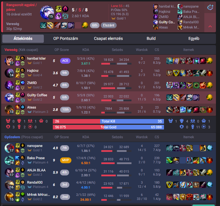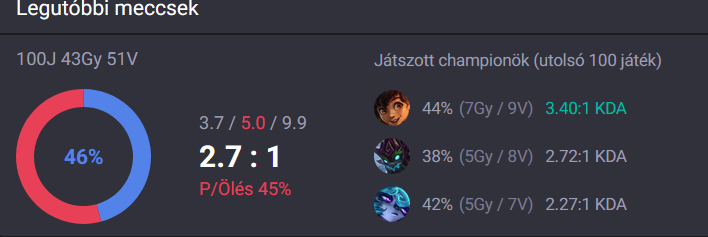 Ti szoktatok legrosszabbak lenni a csapatotokban? Most nem tudom, hogy ez mennyire általános amit én képviselek, de az ilyen lefutja játékosokat sosem értettem, akik 0-10-re mennek és hasonlók, meg kiafkolnak, kitiltelnek. Lehet ezt egyfajta profi mentalitásnak is nevezni talán, de én 90%-ban tudok nyugodtan mérlegelni, nem futom le még ha hátrányban is vagyok, sok meccsen vesztes állásból jövök vissza pont emiatt. Erre sokan nem képesek hiába vannak mondjuk platban, na az olyanoknál azért magamat többre tartom, hiába ugyan az az elo, a konzisztencia is számít. Ahogy így bármikor visszanéztam az eredményeket, a csapatom vagy a meccs legrosszabbjaiban soha nem vagyok ott, ha az északi sarkon ledobnak én akkor is hozok egy csapaton belüli felső házas szintet. Aztán lehet ez általános dolog nem tudom, ezért is kérdem, hogy másnál van olyan, hogy a op.gg vagy dpm szerint a csapat leggyengébb tagja volt?