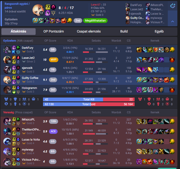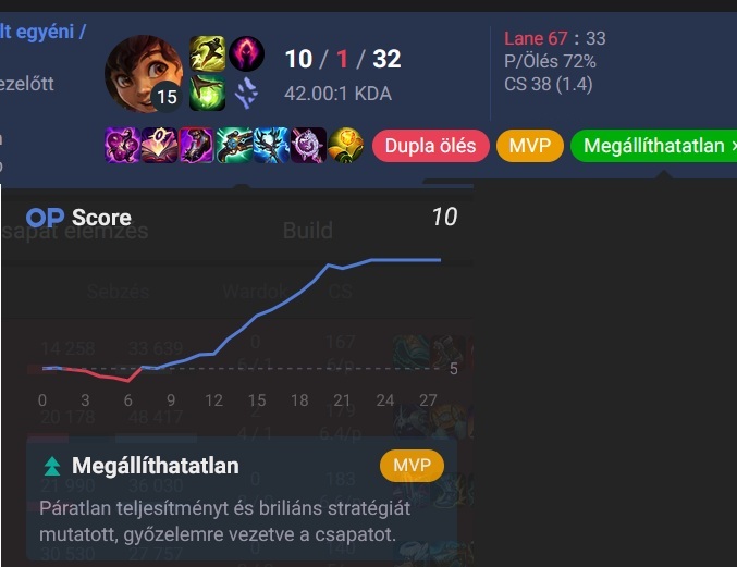 Én magamat a rangon belül egy kimondottan konzisztens játékosnak tartom, szinte mindig akár win akár lose lesz az eredmény, ott vagyok a csapatom top2, de legrosszabb esetben is top3 játékosában. DPM.lol pontszám kiértékelőt szoktam nézni és a DPM-es végpontszám nálam mindig megüt azért a meccs képéhez képest egy elfogadható szintet.