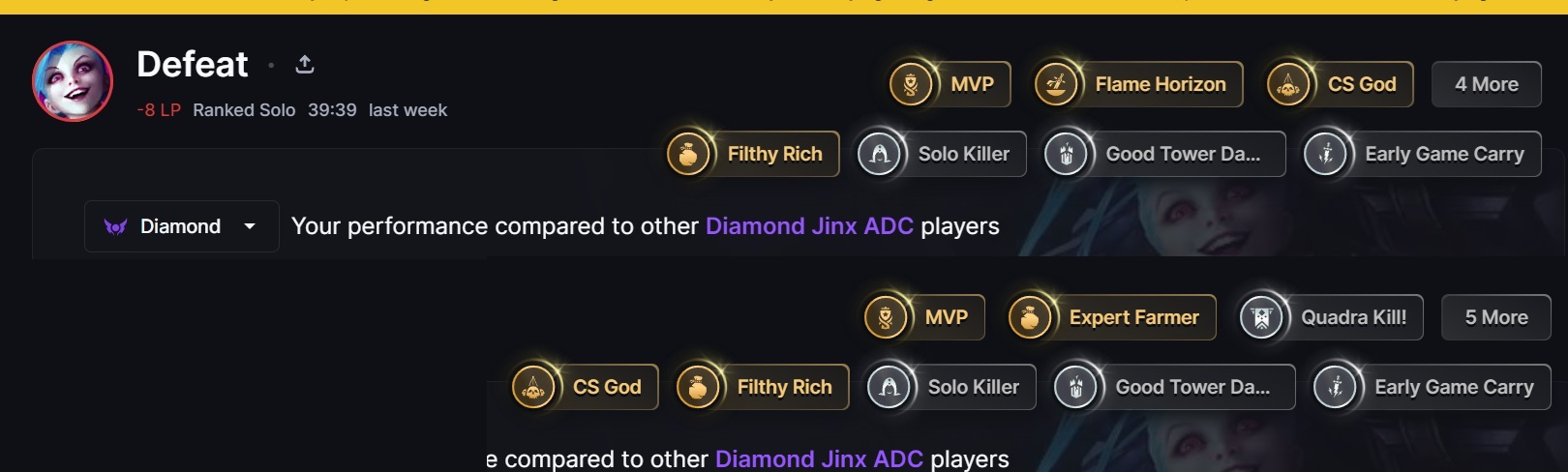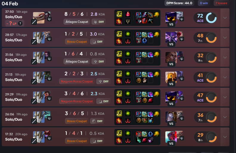 Buildekkel persze kísérletezek valamilyen szinten, de nem rajtam mennek el a meccsek. Szóval még ha engem "semlegesnek" is veszünk, bár score alapján első 2-ben mindig benne vagyok az 5-ből, de akkor is csapattársak tekintetében 50-50 kellene legyen. Viszont objektíven nézve, nálam ritkábban van mvp topos, jungler, adc, mid, supp mint az enemyben. Enemy jungler 10/8 alkalommal jobb.