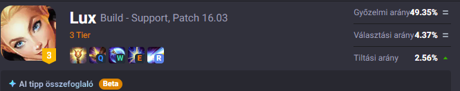 Majd próbálkozom shadowflames burst builddel is, csak az a baj ezekkel (látom más Luxokon), hogy amikor hátrányban vagytok mint csapat és enemyben mindenki fed meg shieldbow, MR stb itemek vannak rajtuk, akkor kb nulla sebzése lesz egy burst Luxnak. A burst akkor jó, ha előnyben vagy(tok), hátrányban nem jó. Ezért szeretem ezt a controlmages buildet, mert mindig a legrosszabbra készülök és abban az esetben ezzel sokkal több kárt tudok okozni az enemy soraiban.