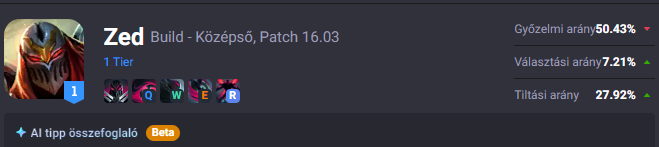 Ez is egy gusztustalan op, bullshit hős, iszonyat cringe ellene játszani, hiába csak 50.4% a winrate, de 28%-ban bannolják, ez nem véletlen.