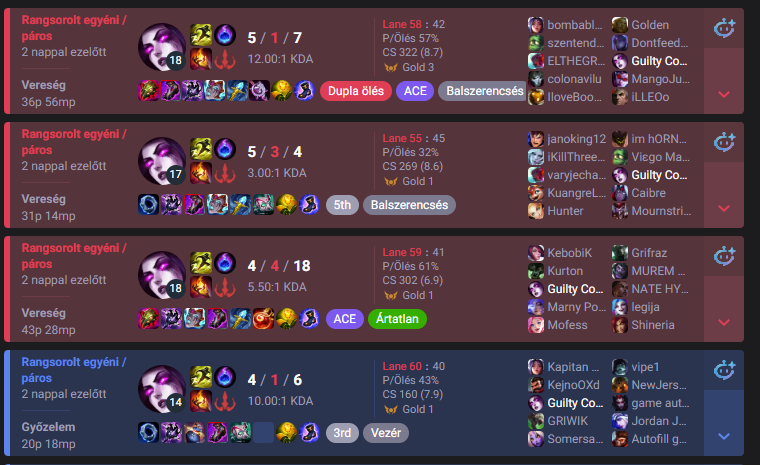 Ezek voltak a Morganás meccsek, nem értem mit írsz. Mindegyiken kimagasló voltam a csapatomon belül... 2 ACE, de ahol nem ott is én voltam az egyik legjobb. Itt ebből a 4 meccsből legalább 3 win megérdemelt lett volna részemről, ha a kiosztott sebzést, farmot, részvételt, kda-t nézzük. Ezt azért lássuk be, hogy az összkép alapján amivel a meccseket lehoztam, nem 1/4 a reális végeredmény.