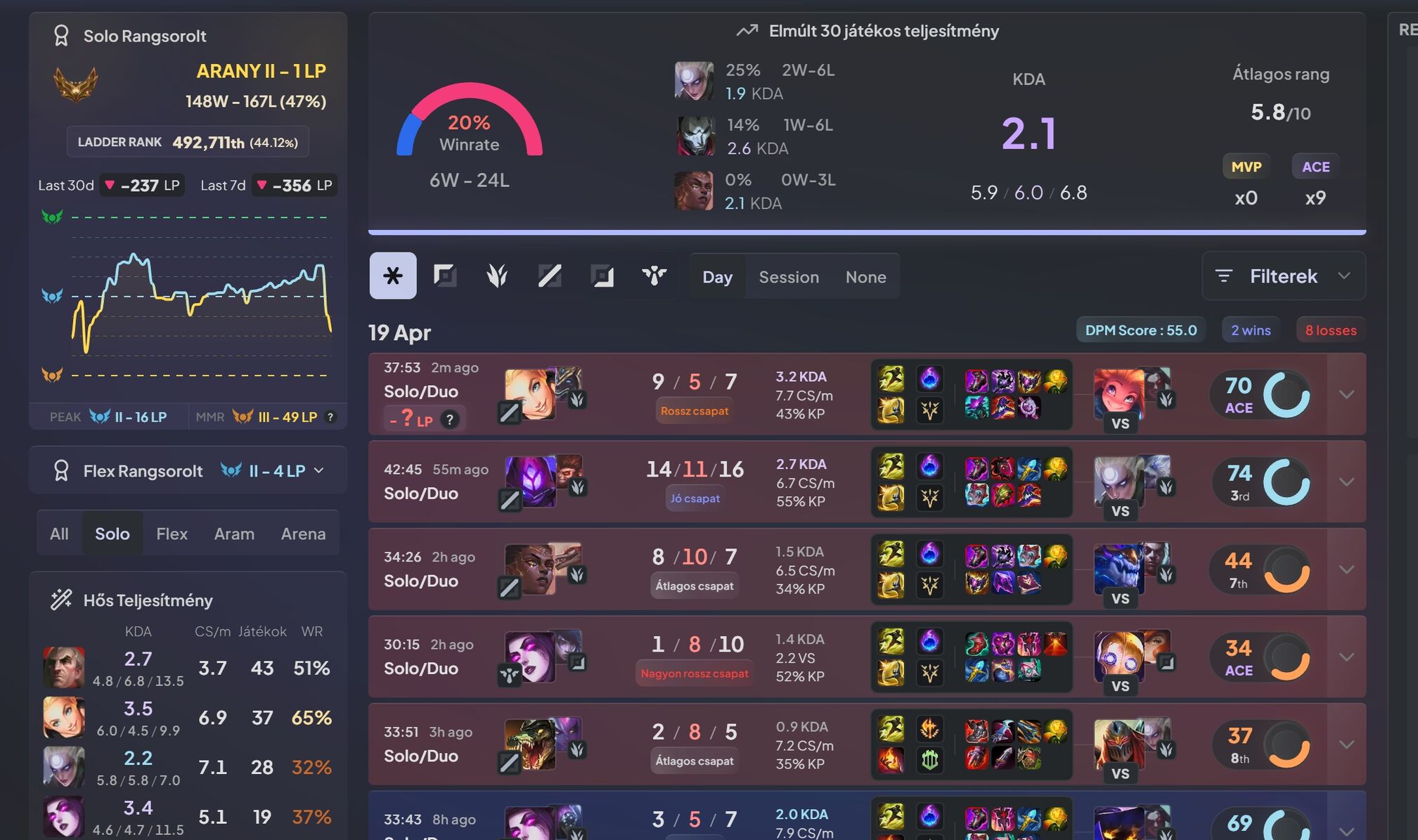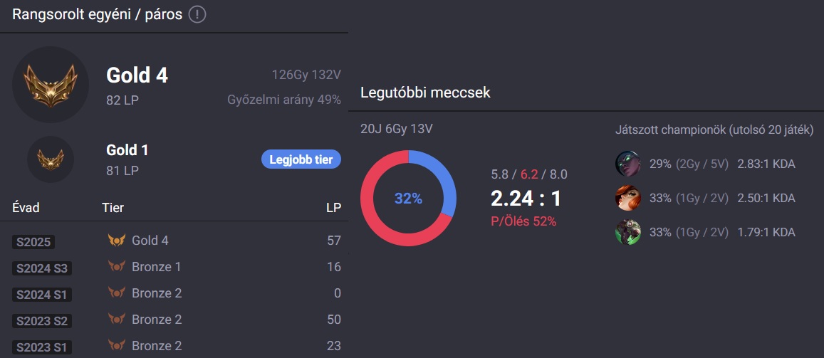 Meg tudod nézni, hogy ahol én rossz voltam, ott milyenek voltak a csapattársak… 20-as op score-val ace lettem, gondolhatod a többiek milyenek voltak. Meg 1-15 top és hasonlók, 0-7-0-ban meccset záró adc valami 3k össz dmg-el.. és ez zsinórban. Mondom rengeteg report kiment és jogosnak is bizonyultak. Meg a rankok is csalókák, mert sokszor jött szembe új account ami éppen climbolt felfelè, ott a tényleges tudás sokkal magasabb volt a jelenleg kiírt szintnèl.