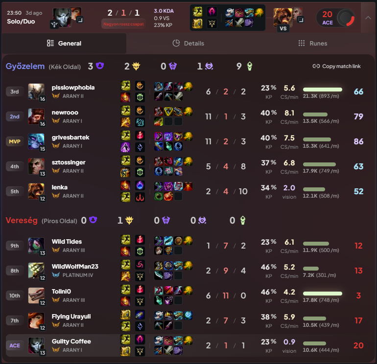 Egyből az ezt megelőző meccs pedig így nézett ki. Nálam normális kda, jó farm, tettem a dolgom, nem múlott rajtam semmi, ellenben 1-9-3-as 3-as azaz 3-as scoret kapó adc volt a csapatban, aki szét feedelte a Melt, Caitot, Zileant, ezzel így halmozott emberhátrányban nehéz megintcsak mit kezdeni, nincsenek jó teamfightok, minden harc bukó, ez nem olyan, hogy "ha jó vagy lehozod", főleg egy csapatharc orientált karakterrel.