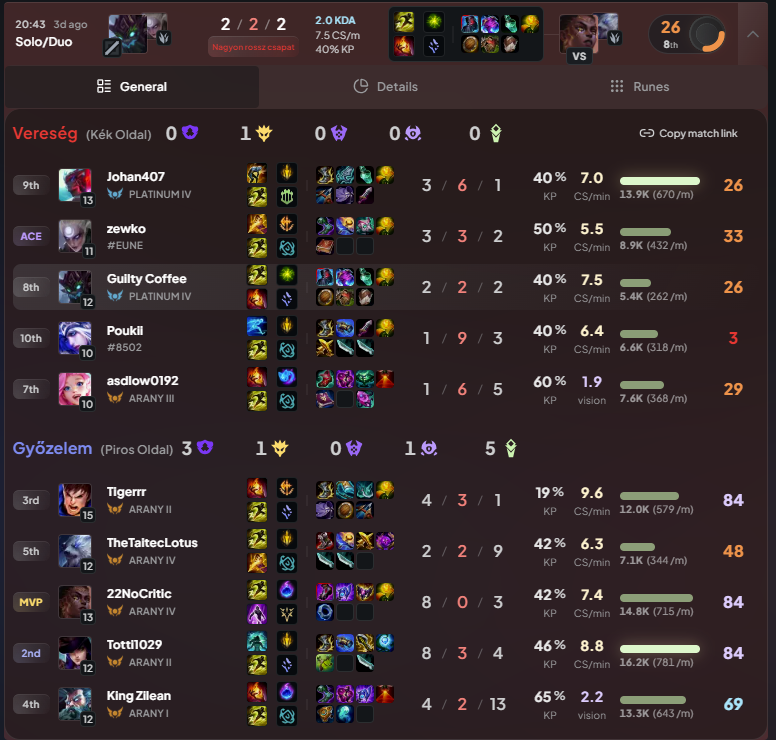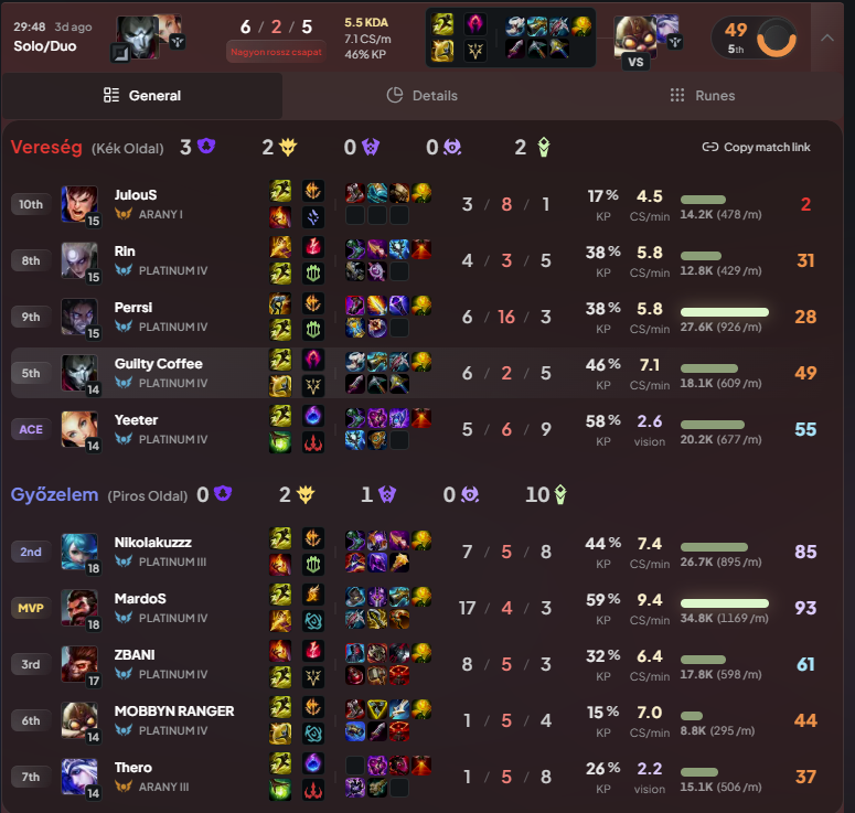 Botot erősen nyertük, én tök stabil voltam mégha a Luxom egy picit sokat is halt, de nem lehetett azzal mit kezdeni, hogy a top nem játszotta a játékot, 17% participation, 2-es azaz 2-es score, illetve nem csak ez, hanem a Sylas midünk pedig 16 azaz 16 alkalommal halt meg a 29 perces meccsen, ez azt jelenti, hogy legkésőbb minden 2. percben, de inkább előbb meghalt.... Ellenben enemy mid, jungle, top természetesen kiválóan játszott.... Olyan volt, mintha egy 2v5 meccs lenne, konkrétan.
