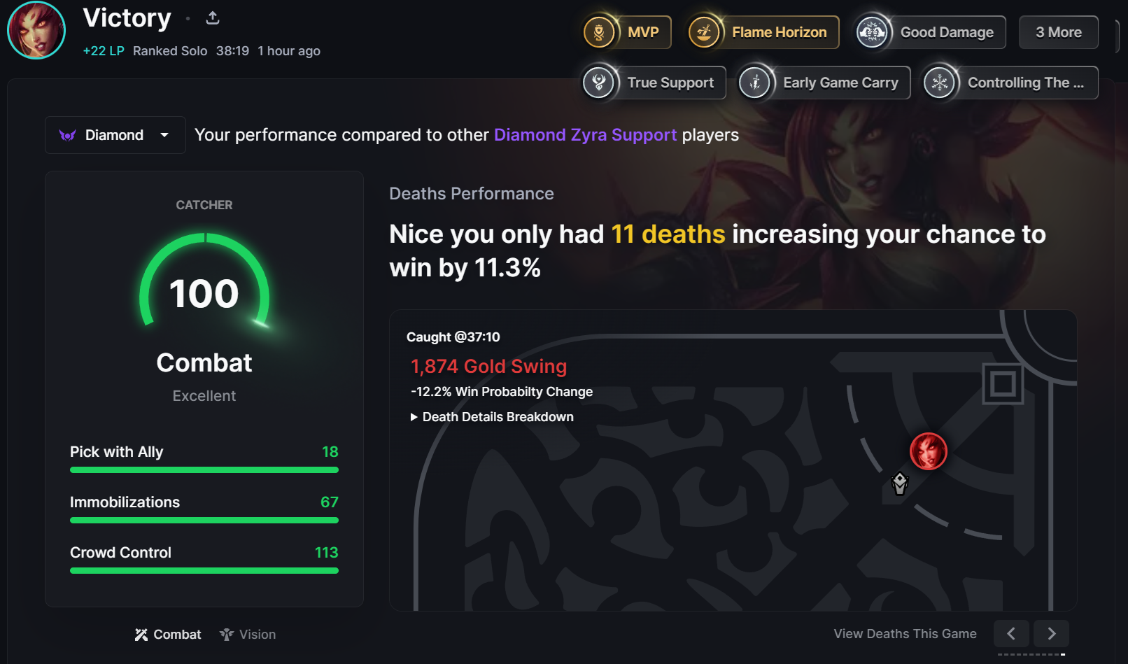 Én ha meghalok, az 90%-ban olyan, hogy van egy 3-4 emberes torony dive, ahol már nem tudok egyszerűen hová menekülni vagy van egy atom fed enemy, mondjuk last match 19 killes Ekko jungle, aki szimplán falon keresztül flash + Q-val megöl úgy, hogy nem is láttam. Vagy van egy teamfight, skirmish ami 50-50 de bele kell menni, most nyilván ott is bármi lehet, Ashe-el folyamat bekaptam a Malphite ultikat, nyilván én voltam a fő target, ezzel nem lehet mit csinálni, bármennyire a csapat mögött helyezkedtem a Malphite elért ultival... De ezek jó halálok, mert ha egy flash + ulti, ráadásul ilyen teamfight eldöntő ulti kijön rád és abba halsz meg, szerintem az megbocsátható, nem lehet vele mit csinálni. Én 90%-ban ilyeneket halok, ezek nem döntés alapú halálok, amik viszont elkerülhetőek.