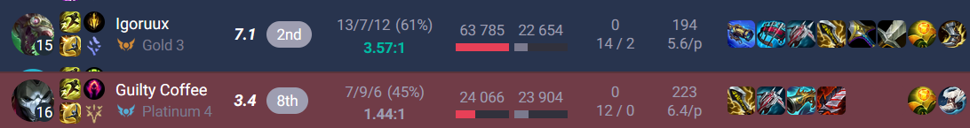Ez a Twich ellened nyert messze, és 2,5x többet sebzett mint te... és ő is túl magasan van goldon, és nagyon gyenge játékai vannak!