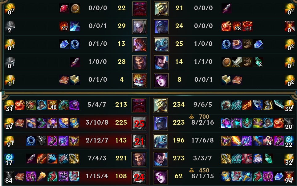 Összességében nézve, farm, kda, sebzés, ha mindent összeadunk én voltam itt a legjobb a csapatomban, úgy overall. Antihealt is egyedül én építettem, bár nem mintha a Kayn ellen hatott volna bármit is. Ilyenkor amúgy sose tudom van-e értelme, mert elméletileg must have építendő ilyen esetekben, de közben meg nem látom, hogy használna.Ezzel egyszerűen nem lehet mit csinálni, hogy mindenki ennyire sokat hal, a Nasus soha nem scalel be, nem farmolnak rendesen, persze enemy topos meg úgy engagel, mintha nem lenne holnap, atom hasznos stb. Ilyenkor több ember helyett kell játszanom, mert az ő hibáik is rajtam csattannak pl. hogy fed enemy ellen kell játszanom, amit nem én okoztam, gold hátrányban vagyunk stb. Yasuo is toxic volt mint állat (mily meglepő), nagyra volt azzal, hogy a Malzát megtudta ölögetni párszor, de ezzel az erővel már utána nem tudott semmi hasznosat csinálni, hülyeségekbe ment bele, feedelt, nem lettünk vele sem előrébb, még splitelni sem volt képes, hogy valami pressuret kialakítson a nagy mellével.