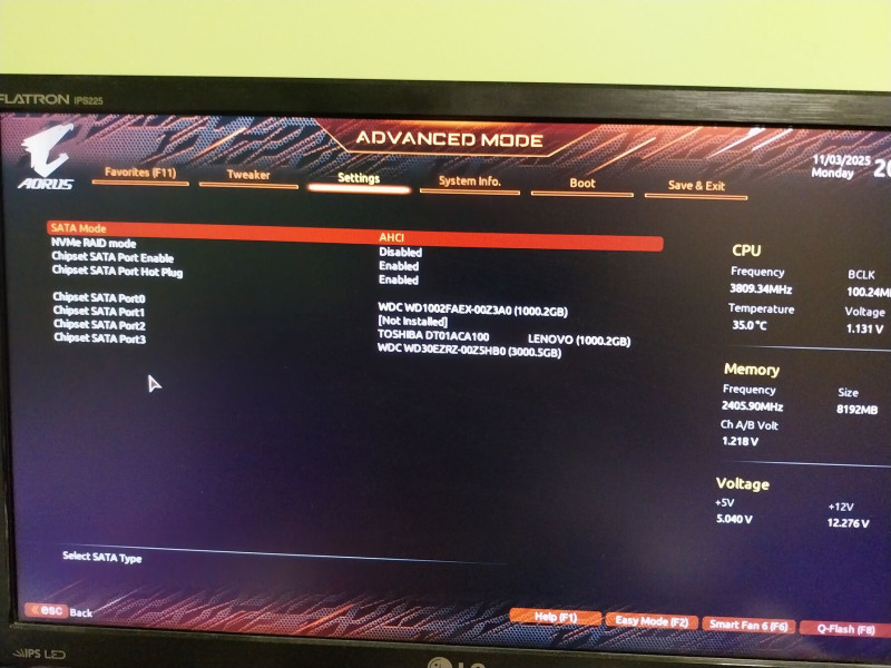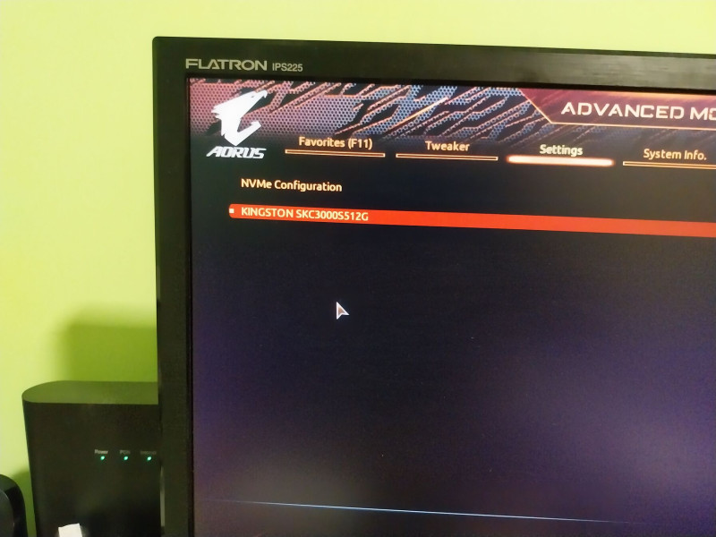 Menü: Settings → SATA and RST Configuration → SATA Mode → AHCI.