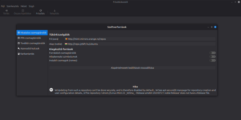 official-package-repositories.list-re is, hogy benne vannak-e, amik kellenek, kb ennél több nem is kell:deb https://mirror.alwyzon.net/linuxmint zara main upstream import backportdeb http://repo.jztkft.hu/ubuntu noble main restricted universe multiversedeb http://repo.jztkft.hu/ubuntu noble-updates main restricted universe multiversedeb http://repo.jztkft.hu/ubuntu noble-backports main restricted universe multiversedeb http://security.ubuntu.com/ubuntu/ noble-security main restricted universe multiverse/etc/apt/sources.list-be is nézz be, ha nincs kikommenmtelve az ott lévő cdrom sor, kommenteld ki.#deb cdrom:[Linux Mint 22.2 _Zara_ - Release amd64 20250828]/ noble contrib main# This system was installed using small removable media# (e.g. netinst, live or single CD). The matching "deb cdrom"# entries were disabled at the end of the installation process.# For information about how to configure apt package sources,# see the sources.list(5) manual. -